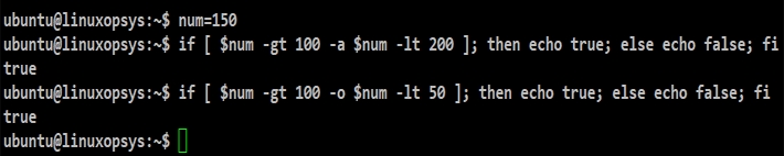 Similarly in the next case, the first part of the expression is true and the second part is false. Combining them -o flag will give the result as true, if the result of any expression is true.